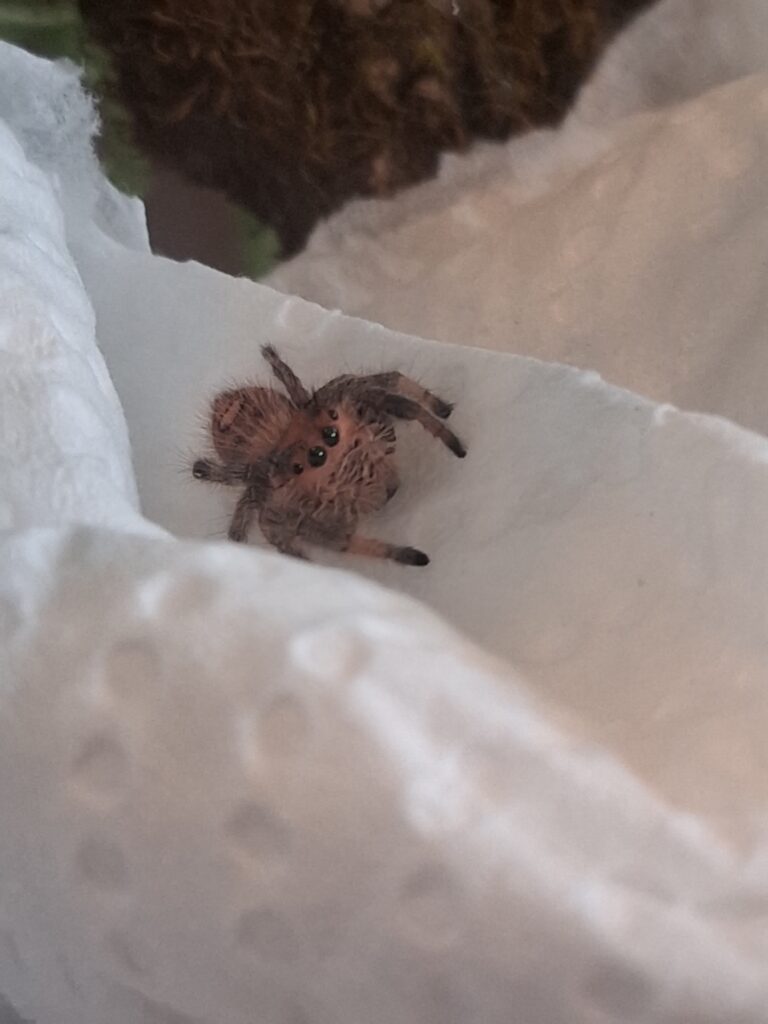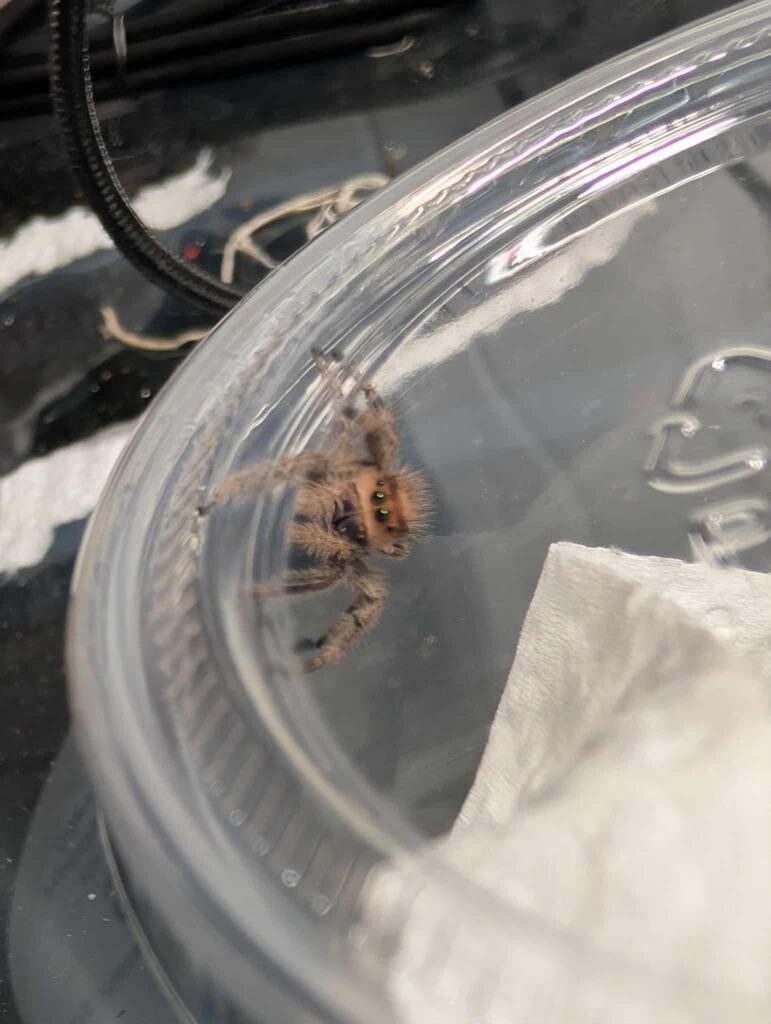 Some jumping spiders are quite adventurous. If you have to remove your jumping spider, use a flat headed paint brush. Offer up the bristle side for the spider to walk on to. Our first spider, Dax, was gentle and sweet and would walk right up to our hands and explore. She also loved kids! (Donut isn’t as adventurous and prefers to watch us from the safety of her home. We love to see her peering out at us, watching with curiosity!)