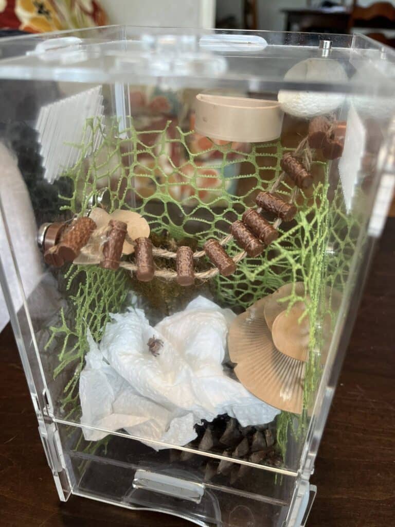 Add twigs, plants, or pieces of cork bark for exploration. We even found a pinecone, and Dax and Donut have spent hours climbing and exploring it! Use leaves, bark, or small natural items for resting and hiding spaces.